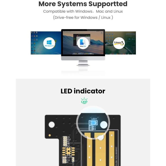 UGREEN M.2 PCIe NVME SSD adapter podržava M-Key i M+B Key 2280/2260/2242/2230 PCIe NVMe M.2 SSD diskove do 4TB, kao što su Samsung 970 EVO Plus/ 970 EVO/ 970 Pro/960 EVO/950 PRO/PM981/SM961/ PM951, WD Black SN750, Crucial P1 1TB, HP EX900, Intel Optane 800P/760P, Toshiba RC100/XG5/XG6, ADATA XPG SX8000, CORSAIR MP300/MP510, Plextor M9Pe /M8Pe, Kingston A1000, Pioneer APS-SE10G-512, Sandisk Extreme PRO m.2.