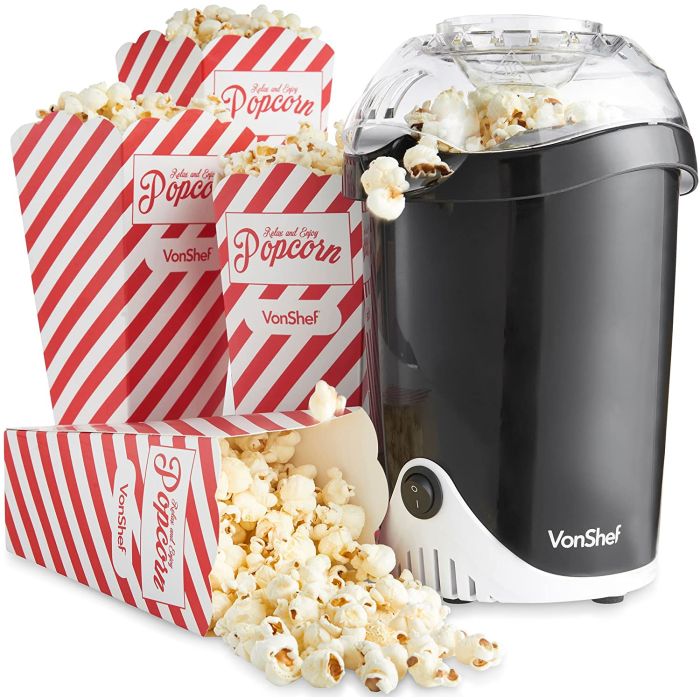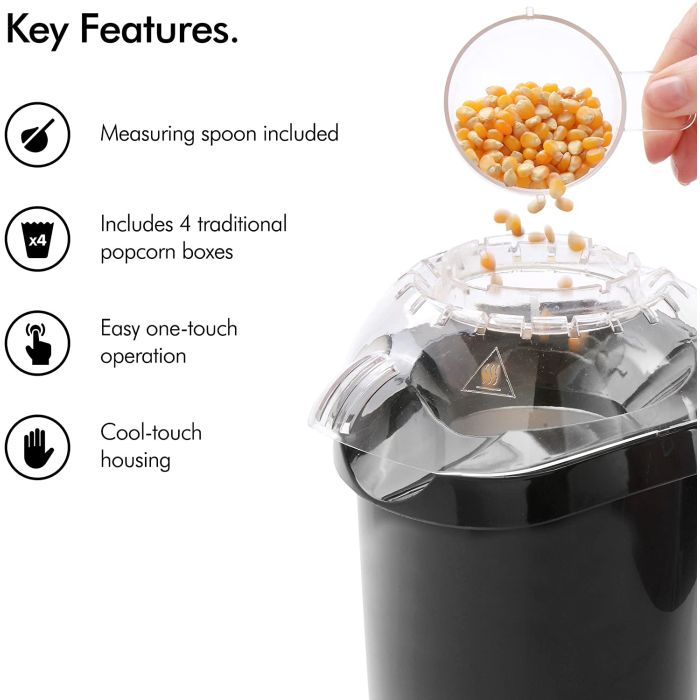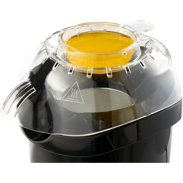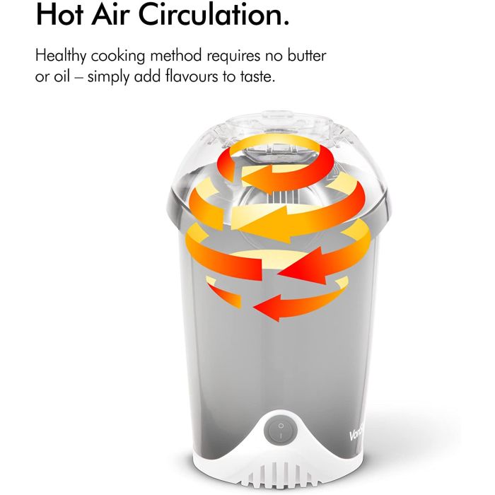 - Stroj radi cirkulacijom vrućeg zraka, što ne zahtijeva ulje ili mast, čineći vaše kokice bez masnoće i odličnim izvorom vlakana.