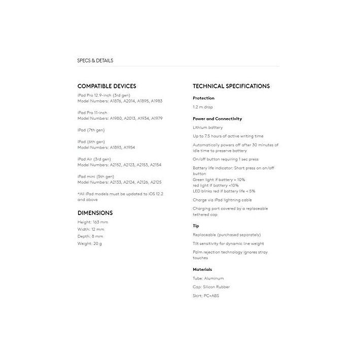 - Kompatibilnost: iPad Pro 12,9 inča 3. generacije (modeli: A1876, A2014, A1895, A1983), iPad Pro 11 inča (modeli: A1980, A2013, A1934, A1979), iPad Air 3. generacije (modeli: A2152, A2123, A2153, A2154), iPad Mini 5. generacije (modeli: A2133, A2124, A2126, A2125), iPad 6. generacije (modeli: A1893, A1954) mora biti ažuriran na iOS 12.2 ili noviji.