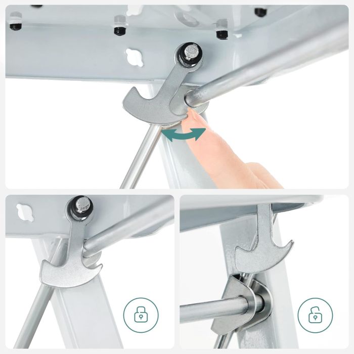 Stabilnost na prvom mjestu - Izdržljiva čelična stepenica sa sigurnosnom šipkom i 4 noge okrenute prema van pruža izvrsnu stabilnost; kada je potpuno otvorena, sigurnosna kuka se automatski zaključava i sprječava slučajno sklapanje.