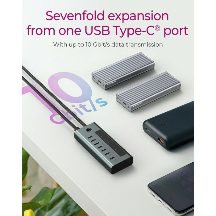 Sedmerostruko proširenje s jednog USB Type-C priključka: Za brzo i jednostavno proširenje USB-C priključaka, hub nudi sedam dodatnih priključaka s brzinama prijenosa podataka do 10 Gbit/s.