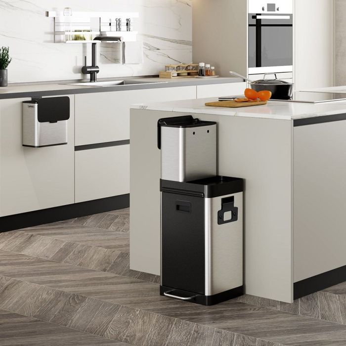 Praktična i elegantna trostruka kanta za recikliranje pametan je dodatak svakoj kuhinji. Čvrsto kućište od nehrđajućeg čelika ima premaz otporan na otiske prstiju, koji održava uredan izgled unatoč čestoj upotrebi.