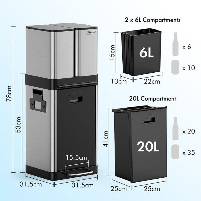 Pojednostavite recikliranje s našom trostrukom kantom s tri pretinca, dizajniranom da vašu kuhinju održa svježom, a istovremeno da vaš doprinos zaštiti okoliša. S dimenzijama 31.5 cm x 31.5 cm x 78 cm, vertikalni dizajn trostruke kante nudi kompaktnu bazu, a opet puno prostora za sav vaš karton, limenke, plastiku ili opći kućni otpad.