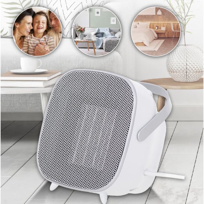 Keramički grijač s učinkovitim keramičkim grijačem. Uređaj ima timer pomoću kojeg možete postaviti vrijeme rada od 1 do 7 sati. LED zaslon prikazuje odabranu temperaturu u rasponu od 15 do 35 °C i 2. razinu snage grijanja. Ventilatorski grijač grije snagom od 1100 W ili 1500 W. Sigurnosni prekidač automatski isključuje napajanje u slučaju prevrtanja uređaja, zaštita od pregrijavanja. Uređaj ima funkcije grijača i ventilatorskog hlađenja.