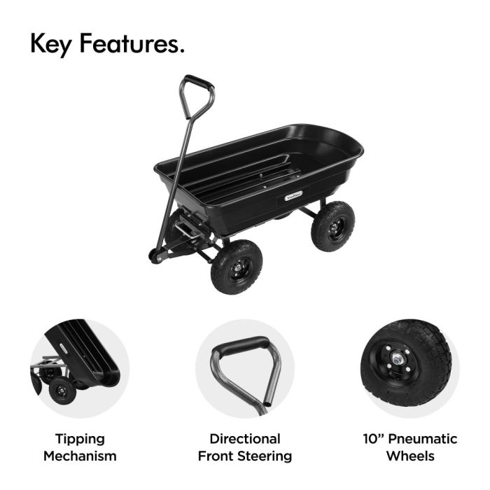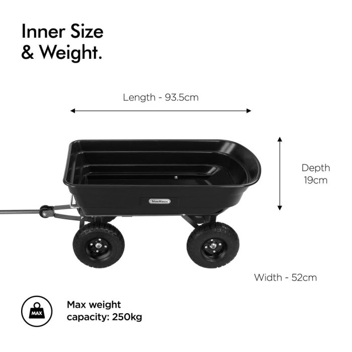 - Ovaj praktični vrtni pomagač ima čvrstu plastičnu kadu kapaciteta 75 l i može prevesti do 250 kg tereta ili do 180 kg ako se koristi kiper.