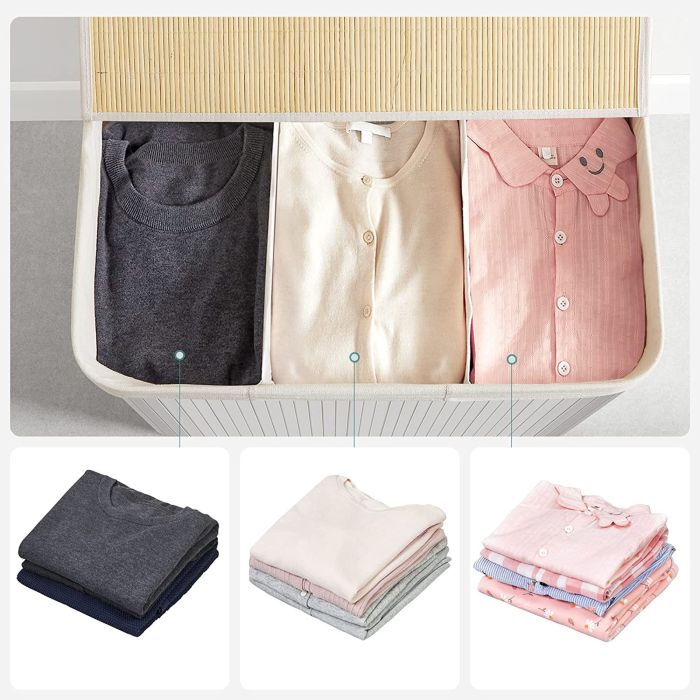 Košara za rublje mjeri 60 x 40 x 61,5 cm (D x Š x V) i ima veliki kapacitet od 150 l za vašu odjeću, ručnike i posteljinu. S tri pretinca možete sortirati odjeću različitih boja.