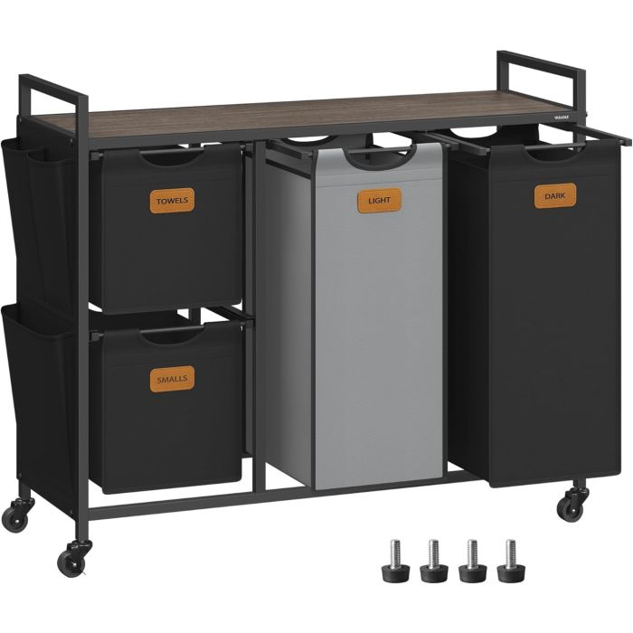 VASAGLE košara za rublje s 4 ladice, sortirnica rublja 150 l, mobilna kolica s policama, uklonjive vrećice, 6 etiketa, kestenjasto smeđa, tinta crna i golublje siva