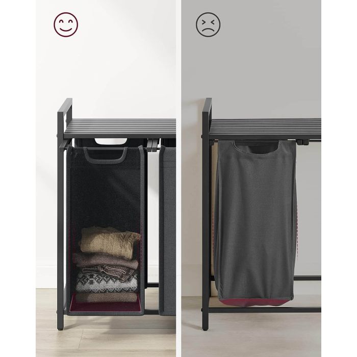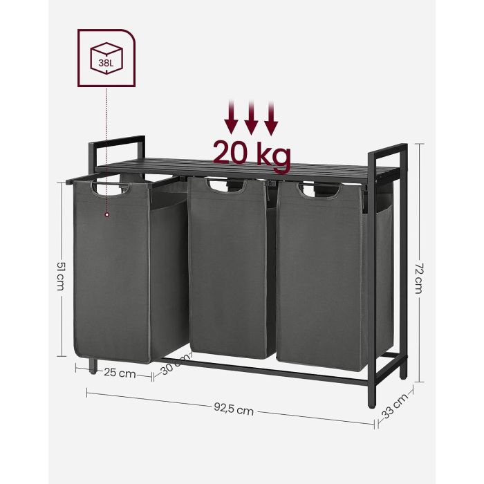 3 odjeljka za odvojenu pohranu : Košara za rublje ima ukupni kapacitet od 114 L , a svaka košara ima kapacitet od 38 L. Njezin dizajn s 3 odjeljka omogućuje vam organiziranje rublja po redovima i odvajanje svijetlog rublja od tamnog.