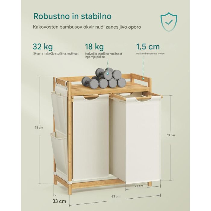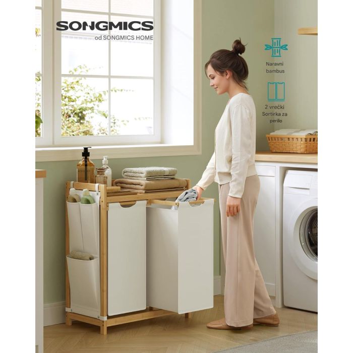 Ova elegantna košara za rublje izrađena od prirodnog bambusa unosi praktičnost i toplinu u vaš dom. S kapacitetom od 100 L i dvije odvojene vreće, možete jednostavno sortirati svijetlo i tamno rublje. Gornja polica i bočni džepovi pružaju dodatni prostor za deterdžente i sitni pribor, a uklonjive vreće olakšavaju prijenos do perilice rublja. Stabilan i prirodan dizajn prekrasno se uklapa u svaki interijer.