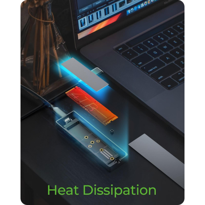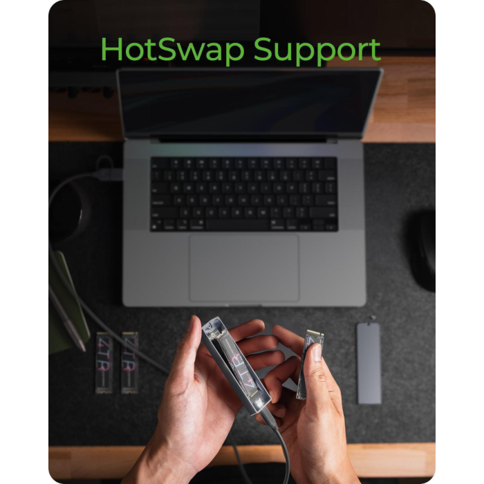 Kućište podržava širok raspon M.2 formata od 2230 do 2280 i opremljeno je M-Key utičnicom koja omogućuje korištenje i NVMe i SATA SSD-ova. Veza putem USB-C 3.2 Gen 2 pruža brzine do 10 Gbit/s, a priloženi kombinirani USB-C/USB-A kabel od 60 cm omogućuje korištenje s raznim uređajima. Za stabilan rad uključena je termalna podloga koja učinkovito odvodi toplinu sa SSD-a na kućište. HotSwap podrška omogućuje brzu zamjenu SSD-a bez isključivanja sustava, što je idealno za nadogradnje, sigurnosne kopije ili rad s više diskova. Kućište je kompatibilno sa sustavima Windows, macOS i Linux, tako da se može integrirati u razna okruženja bez dodatnih upravljačkih programa.