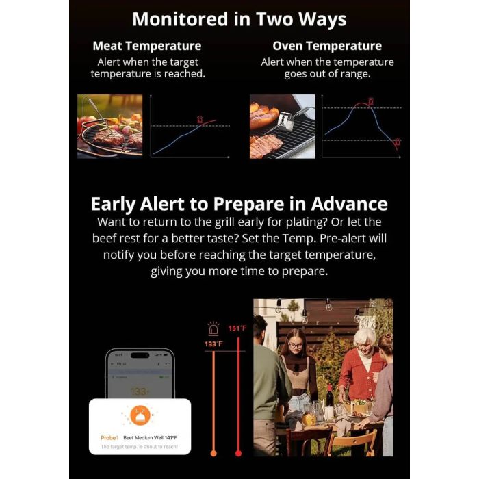 Postavite rano upozorenje za pripremu posluživanja ili odmaranje mesa prije nego što temperatura dostigne ciljanu temperaturu. Više vremena za savršenu pripremu.