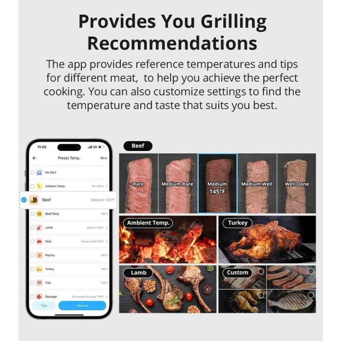 Aplikacija nudi referentne temperature i savjete za različite vrste mesa (govedina, janjetina, perad, riba, kobasice itd.). Također možete prilagoditi postavke za savršen okus.