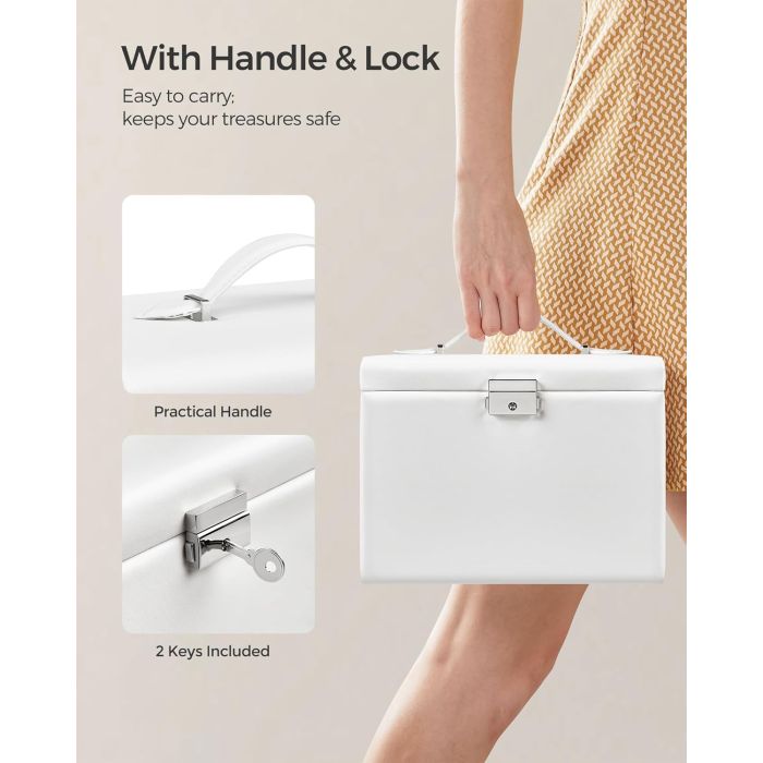 Zaključavanje i prenosivost: Organizator za nakit dolazi s dva ključa za zaključavanje vaših dragocjenih komada izvan dohvata djece. Zahvaljujući ručki na vrhu, ova mala kutija za nakit praktična je za putovanja.
