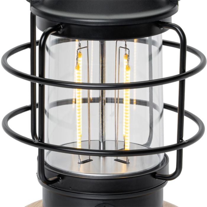 Kombinirajući izdržljivost i eleganciju, svjetiljka Lamparina ima čvrsti lakirani metalni okvir, bambusovu bazu i prozirno plastično sjenilo. To je svestrano rješenje za kampiranje, okupljanja na otvorenom ili hitne slučajeve.