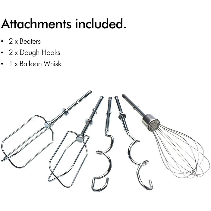 - Priloženi dodaci: 2 mutilice, 2 nastavka za miješanje tijesta, 1 pjenjača za tijesto