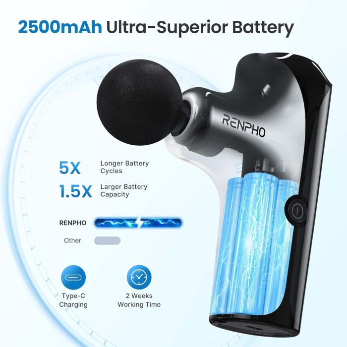Visokokvalitetna litij-ionska baterija: Intenzitet masaže ovisi 30% o kapacitetu baterije pištolja za masažu. Renpho mini pištolj za masažu napaja se visokokvalitetnom, nadograđenom 3C litij-ionskom baterijom. Ova baterija poboljšava iskustvo 3 puta pružajući bolju snagu, nižu temperaturu, stabilan rad i sigurnost, a također produžuje vijek trajanja proizvoda. Ovaj pištolj za dubinsku masažu tkiva puni se putem USB-C priključka.