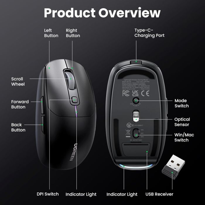 UGREEN miš ima ugrađenu bateriju od 700 mAh i može se puniti putem univerzalnog USB-C priključka.