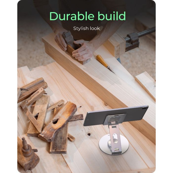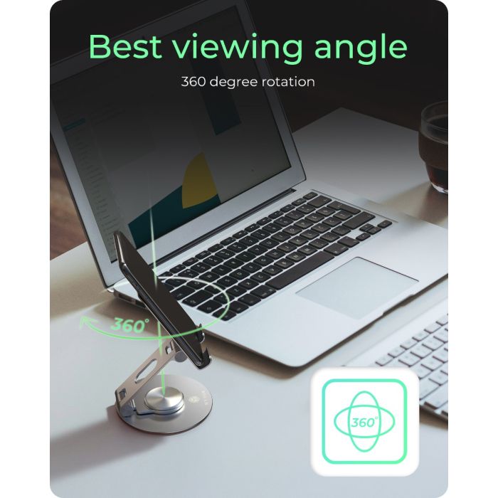 Držač ICYBOX IB‑TH201‑R kombinira vrhunsku izradu i upotrebljivost. Omogućuje potpunu rotaciju montiranog uređaja od 360°. Podesiva ploča drži uređaje veličine do 12,9" i osigurava stabilnost. Izrađen je od mješavine aluminija, robusnog čelika i silikonskih jastučića koji sprječavaju klizanje ili ogrebotine. Držač je lagan i kompaktan za nošenje - pogodan za korištenje kod kuće, u uredu ili u pokretu. Svoje mjesto pronalazi među korisnicima koji koriste tablete ili telefone za posao, gledanje sadržaja ili video komunikaciju.