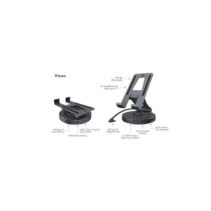 Zahvaljujući širokim i moćnim mogućnostima povezivanja, možete spojiti vanjske zaslone na nosač i koristiti svoj tablet ili pametni telefon kao potpuno funkcionalno računalo. Uživajte u praktičnosti radnog okruženja s više zaslona. Model IB-TH100-DK idealno je središte za hibridno radno okruženje. Putem HDMI 2.0 priključka možete spojiti svoj pametni telefon ili tablet na dodatni monitor u rezolucijama do 4K pri 60 Hz.