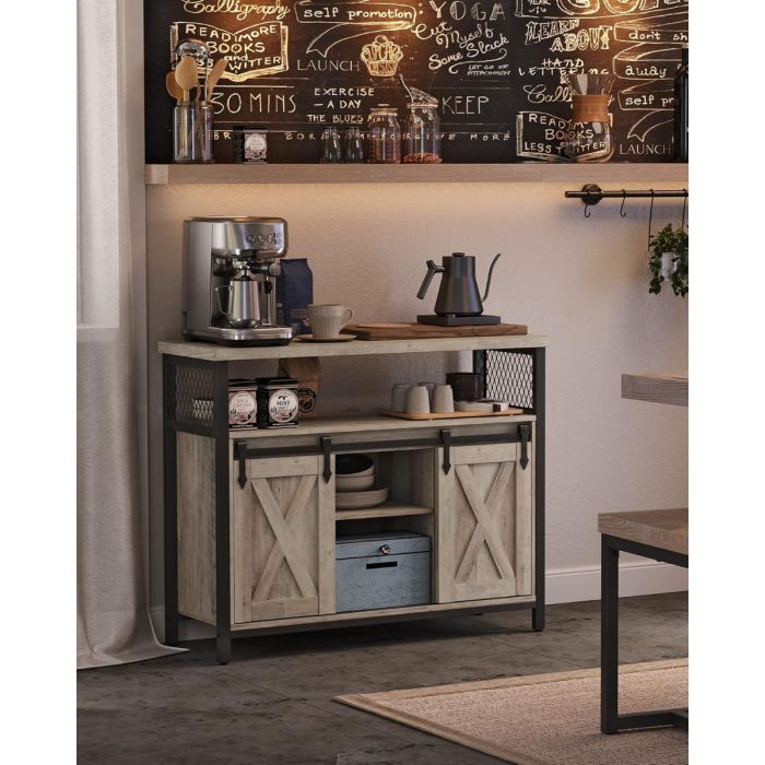 Spojite funkcionalnost i estetiku s VASAGLE komodom u modernom industrijskom stilu. Gornja površina nudi prostor za ukrase, biljke ili kućanske aparate, dok dva prostrana ormarića s vratima i središnja otvorena polica pružaju obilje prostora za pohranu. Unutarnje police podesive su po visini u tri razine, što vam omogućuje da ih prilagodite svojim potrebama - bilo da se radi o tanjurima, čašama, knjigama ili drugim predmetima. Stabilan metalni okvir, izuzetno izdržljiva iverica i podesive nožice osiguravaju ravnotežu čak i na malo neravnim podovima. Siva boja drva u kombinaciji s crnim okvirom dodaje moderan i topao karakter svakom prostoru.