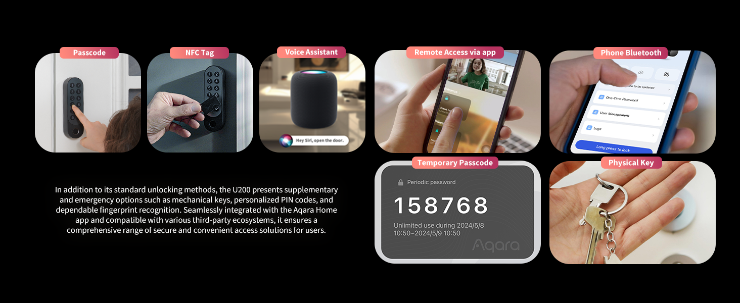NFC Aqara Smart Lock U200 nudi različite načine otvaranja vrata: očitavanje otiska prsta, NFC (otvaranje vrata telefonom ili karticom), lozinka, sve do integracije s Apple Home tipkama. Elektroničke brave na vratima Aqara U200 podržavaju Matter standard, koji omogućuje upravljanje putem aplikacije Aqara Home. Robusni dizajn i šestomjesečni vijek trajanja baterije u kombinaciji s vodootpornošću IPX5 čine kombiniranu bravu U200 idealnom za unutarnju i vanjsku upotrebu.