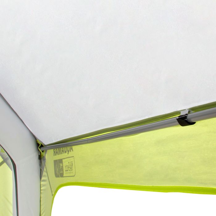 Bazirana na vrlo popularnoj Medusa vanjskoj nadstrešnici, Aquamar nudi dobro zaštićen životni prostor dok boravite na plaži, u vrtu ili pored vaše kamp-kućice ili kampera. Izbjegnite muke sastavljanja tradicionalnih sustava s šipkama uz ovaj inovativni Airframe sustav. Napuhuje se za manje od dvije minute pomoću priložene dvostrane pumpe, pružajući trenutnu zaštitu od sunca i kiše. Dostupne su i opcionalne bočne stijenke (set od 2), koje pružaju privatnost za presvlačenje ili spavanje. Isporuka uključuje torbu za nošenje i pribor za postavljanje.