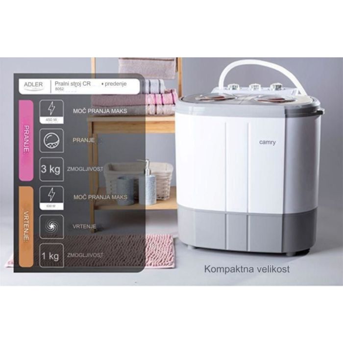 2-u-1 perilica rublja + centrifuga CAMRY CR8052 savršeno je rješenje za vas ako volite provoditi vrijeme s obitelji na putovanjima i ako volite provoditi odmor u ljetnoj kućici ili kampiranju. Čak i tijekom praznika vrijedi brinuti se o redu i čistoći oko sebe. Najčešće je upravo potreba za pranjem ta koja nam oduzima san. Vrijeme koje bi bilo potrebno za ručno pranje odjeće cijele obitelji može se puno bolje iskoristiti! Dakle, ako tražite moderno rješenje za pranje odjeće izvan kuće, ne morate dalje tražiti! Ovaj uređaj će raditi u svim uvjetima!