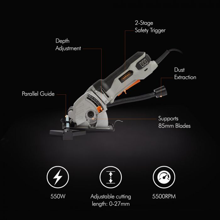 Izdržljivi motor od 550 W omogućuje višenamjenskoj pili rotaciju brzinom do 5500 okretaja u minuti za jednostavno rezanje raznih materijala poput šperploče, iverice, punog drva, pločica i aluminija.