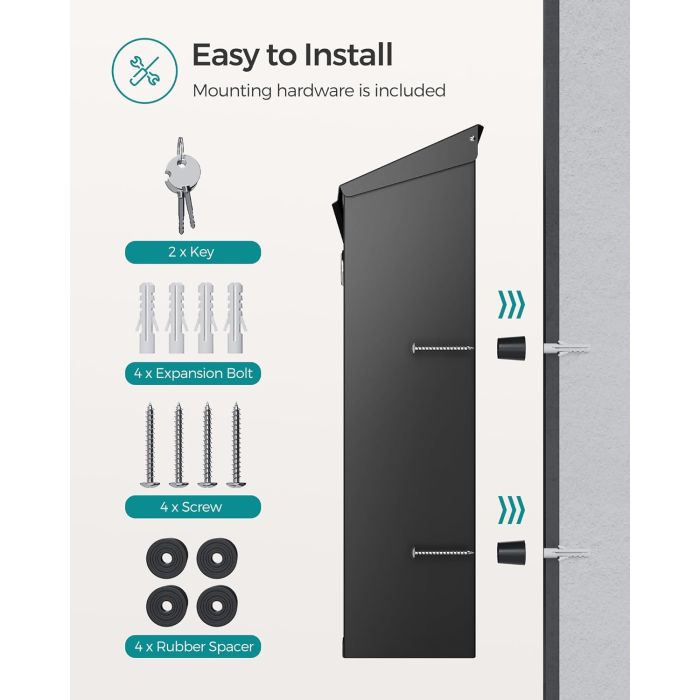 Jednostavna montaža: Poštanski sandučić uključuje sve potrebne vijke, dilatacijske spojeve i gumene podloške. Može se lako ugraditi na ulaz ili vrata pomoću bušilice.