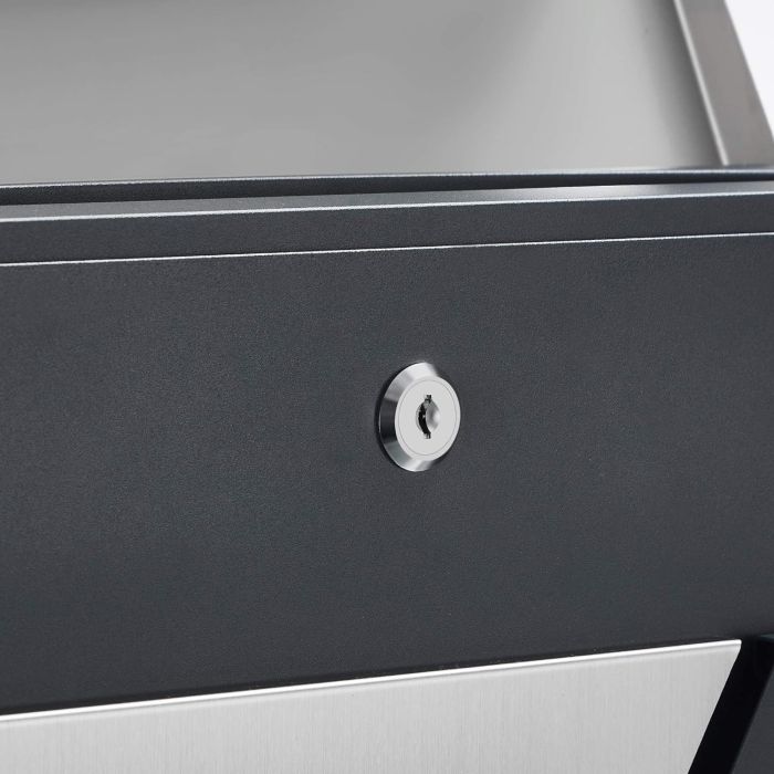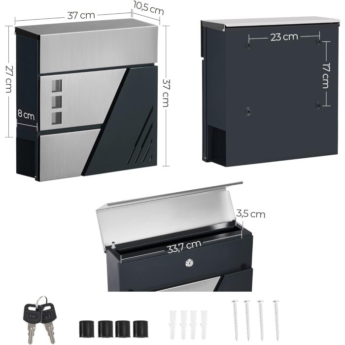 Izrađen je od nehrđajućeg čelika i čelika s praškastim premazom za svakodnevnu upotrebu; Poklopac se tiho zatvara nakon što poštar ubaci poštu ; Prozirni prozorčići obavještavaju vas ima li što unutra; Uključena su 2 ključa za zaključavanje; Ima držač za novine na dnu; Lako se montira na zid pomoću priloženog montažnog pribora.