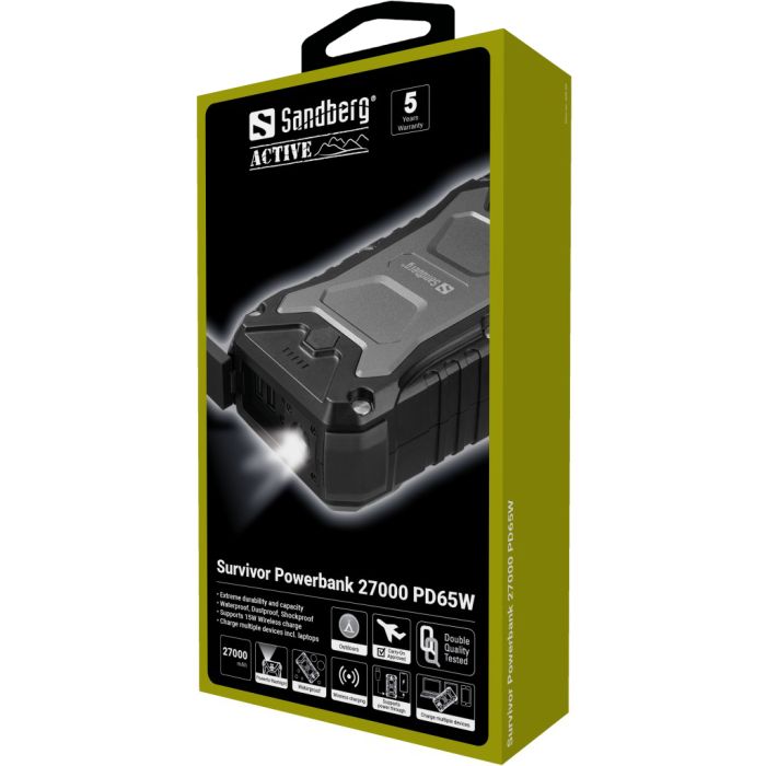 Sandberg Survivor Powerbank 27000 PD65W je savršena rezervna baterija za punjenje mobitela, prijenosnih računala i drugih mobilnih uređaja. Prijenosna baterija smještena je u robusnom kućištu, zaštićenom prema IP66 standardu, tako da može izdržati doista grubo rukovanje. Potpuno je otporna na vodu, udarce i prašinu, tako da je možete ponijeti sa sobom gotovo bilo gdje. Ima 2 snažna USB izlaza, uključujući QC 3.0 izlaz kapaciteta do 18 W. Također ima USB-C priključak za punjenje USB-C uređaja do 65 W, što je dovoljna snaga za gotovo sve modele prijenosnih računala. Na stražnjoj strani nalazi se snažna svjetiljka s ne manje od 120 lumena LED svjetala.