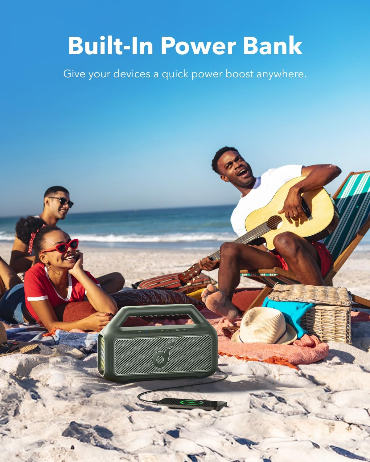 Vanjski zvučnik Boom 2 reproducira ritmove 24 sata s jednim punjenjem, a ugrađena powerbanka omogućuje vam punjenje telefona gdje god se nalazili. (Vrijeme reprodukcije može varirati ovisno o glasnoći i sadržaju.)