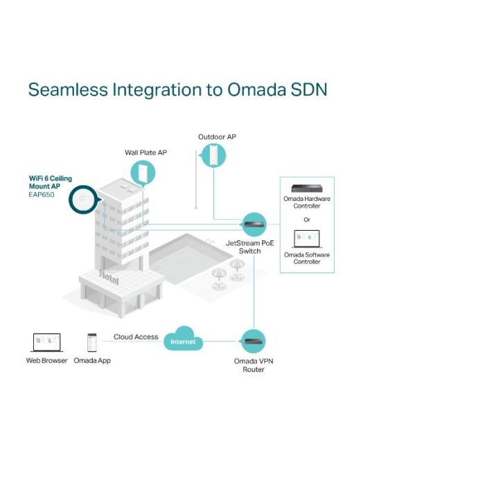 Centralizirano upravljanje oblakom: Omada SDN integracija upravlja cijelom mrežom lokalno ili iz oblaka putem web sučelja ili Omada aplikacije.