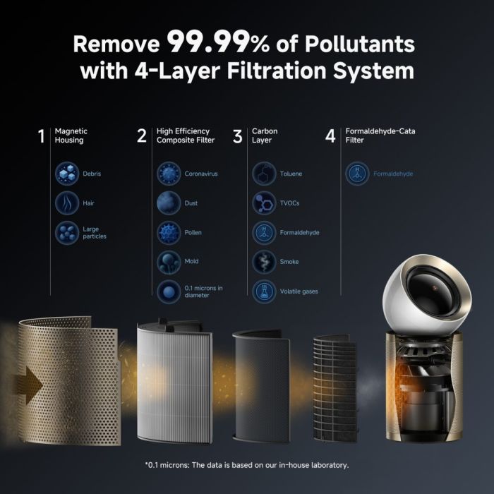 Zaboravite na bakterije, klice i neugodne mirise u zraku uz dvostruki sustav uklanjanja štetočina. Napredna kombinacija visokoenergetskog UVC svjetla i PlasmaNova tehnologije oslobađa pozitivne i negativne ione koji uništavaju viruse i bakterije, sterilizirajući i dubinski pročišćavajući zrak na mikroskopskoj razini.