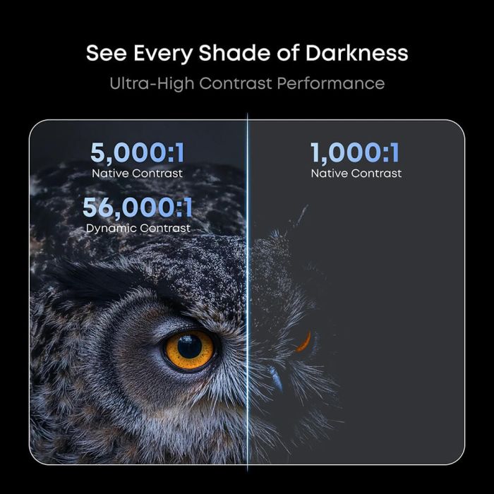 - Pogledajte svaku nijansu tame s ultra visokim kontrastom: Dijafragma sa 6 lamela omogućuje izvorni omjer kontrasta od 5000:1, nadograđen NebulaMaster tehnologijom koja doseže impresivnih 56 000:1.