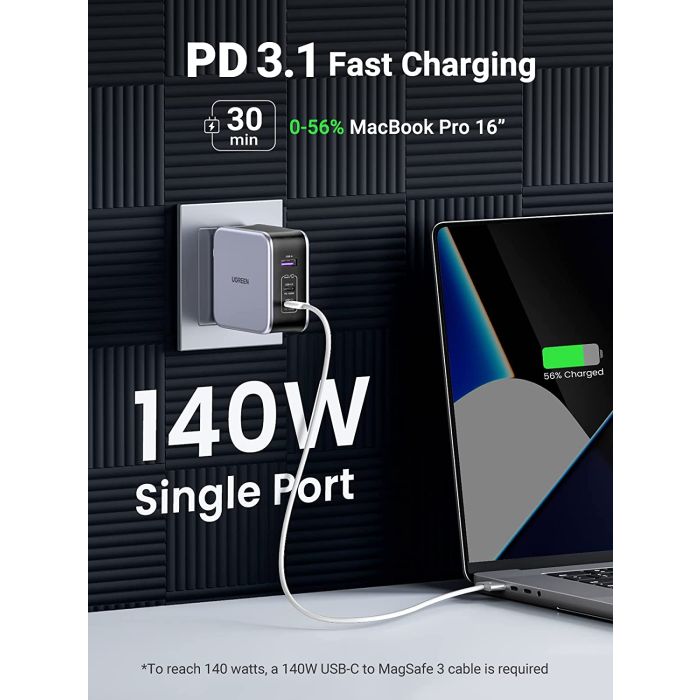 Ugreen 140W USB C adapter za napajanje podržava naprednu PD 3.1 tehnologiju na C1 priključku, a s izlaznim naponom od 28 V, ovaj Nexode adapter za punjenje može postići maksimalnu izlaznu snagu od 140 W na C1 priključku za vaše uređaje.