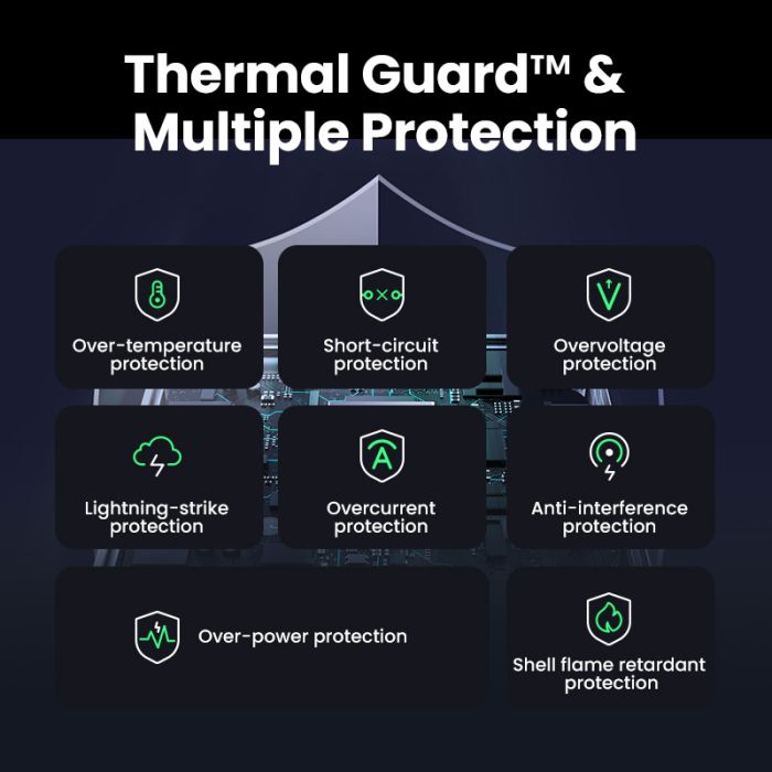 UGREEN osigurava maksimalnu sigurnost korištenja, zbog čega je Nexode Air punjač opremljen brojnim sigurnosnim značajkama. One pouzdano štite od potencijalnih opasnosti, uključujući pregrijavanje, kratke spojeve, preopterećenje, prekomjernu struju i prekomjernu snagu. Osim toga, inteligentni sustav upravljanja napajanjem automatski prilagođava snagu punjenja spojenom uređaju kako bi pružio još veću zaštitu.