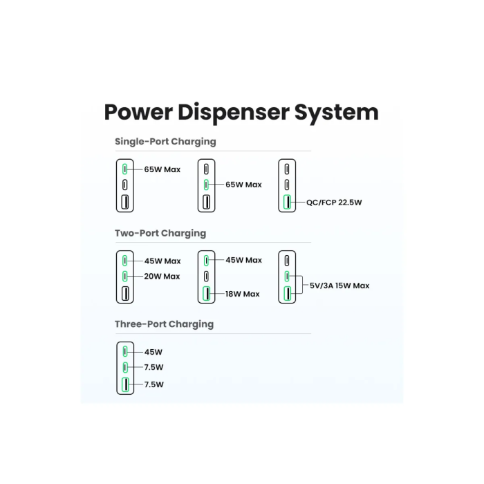 S 2 USB C priključka i 1 USB A priključkom, UGREEN Nexode Pro punjač podržava brzo punjenje za 3 uređaja istovremeno s inteligentnim sustavom distribucije struje, pružajući ukupno do 65 W snage. A kada spojite tri uređaja, snaga će se učinkovito raspodijeliti između priključaka kako bi se osiguralo najbolje punjenje.