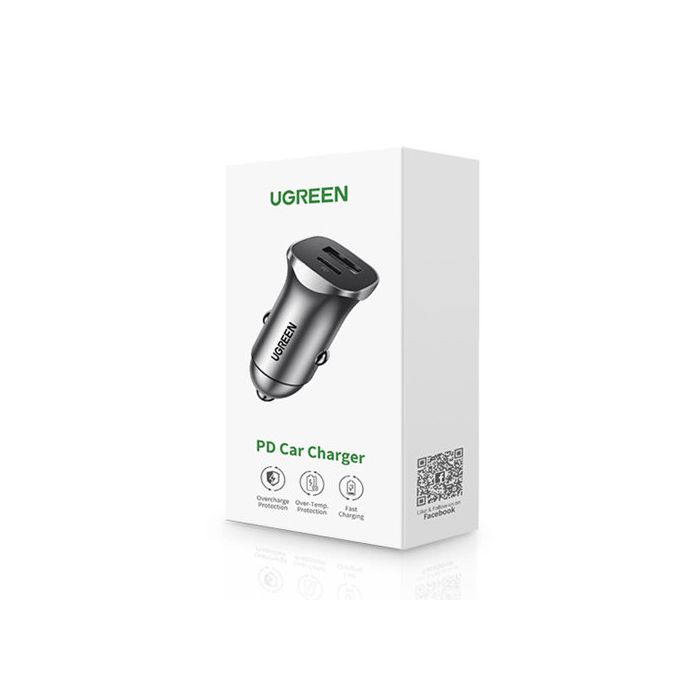 - Punjač UGREEN za automobil, USB + USB-C, PD 18W, kutija, sivi