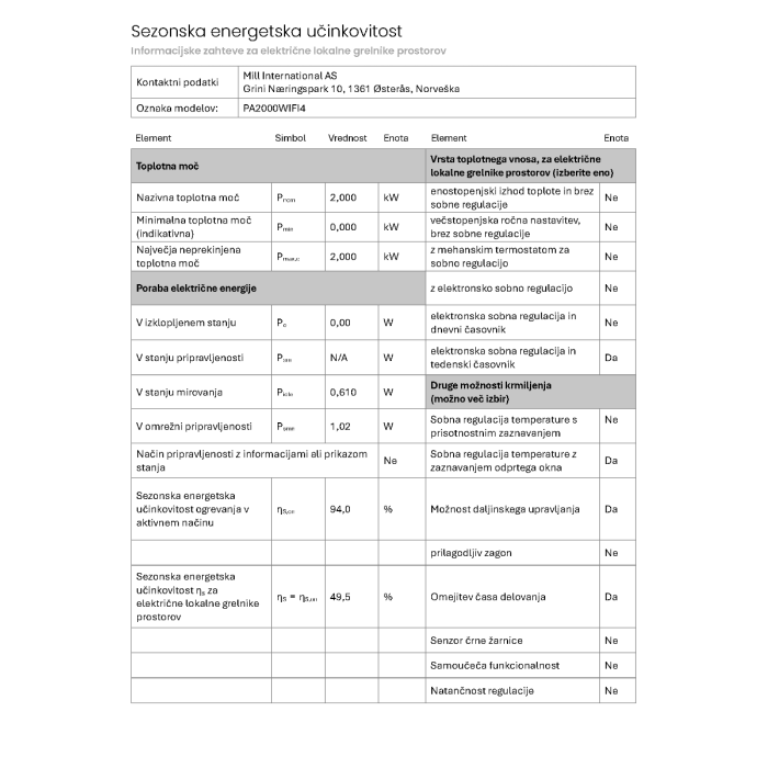 - Radijator MILL PA2000WIFI4, panelni konvekcijski, Wi-Fi, 2000W, čelik, bijeli