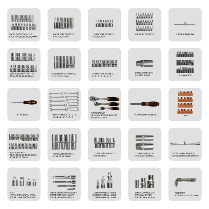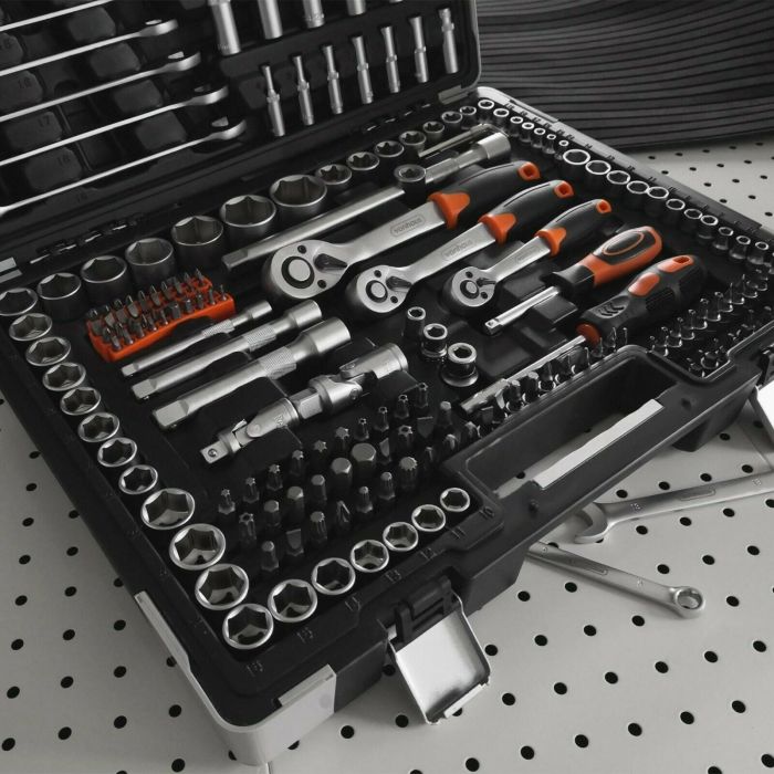 - Ovaj set od 215 dijelova opremljen je račvama, ključevima i torx nastavcima od 1/4”, 3/8”, 1/2” te raznim vrhunskim alatima, nasadnim ključevima i priborom od ugljičnog čelika te više od stotinu krom-vanadijskih nastavaka za svakodnevnu upotrebu.