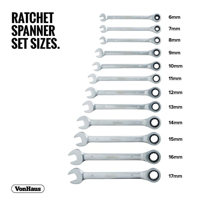 Visokokvalitetni set okasto-kombiniranih ključeva od 12 dijelova - sastoji se od 6 mm, 7 mm, 8 mm, 9 mm, 10 mm, 11 mm, 12 mm, 13 mm, 14 mm, 15 mm, 16 mm i 17 mm.