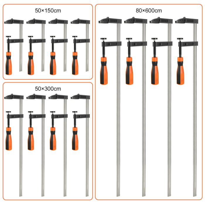 - Komplet uključuje: 4 x 300 mm x 50 mm F stezaljke, 4 x 600 mm x 80 mm F stezaljke, 5 x 150 mm x 50 mm F stezaljke