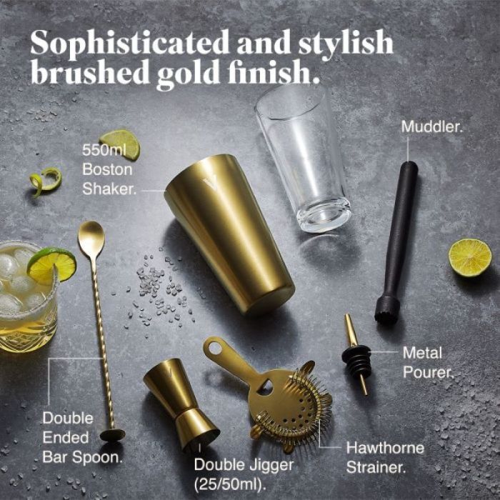 Ništa ne odiše bezvremenskom klasom, stilom i sofisticiranošću poput brušenog zlatnog finiša; i ovaj set za koktele nije iznimka. U kombinaciji s kultnim oblikom zloglasnog Boston shakera, naš set za koktele odmah će podići vaš kuhinjski pult. A da ne spominjemo njegovu svestranost!