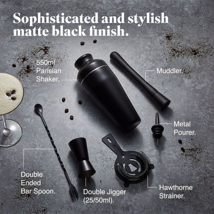 Podignite svoje koktel zabave na višu razinu s mat crnim pariškim setom za koktele, setom od šest dijelova dizajniranim da vašu kućnu miksologiju podigne na višu razinu. S elegantnom mat crnom završnom obradom i osnovnim alatima potrebnim za miješanje bilo kojeg pića, dočekajte večeri majstorstva koktela u svom domu.