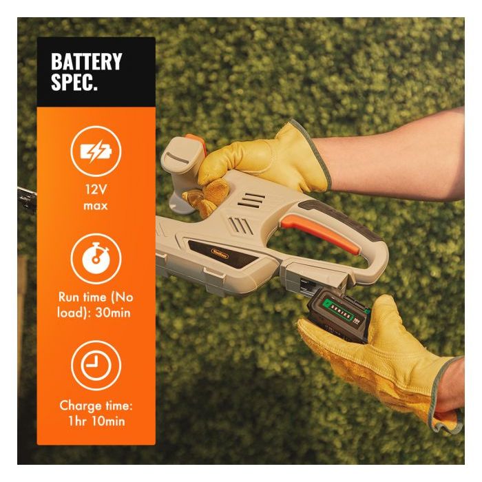 Snažne, kompaktne i lagane akumulatorske škare za grmlje VonHaus napajaju se litij-ionskom baterijom od 12 V MAX 2.0 Ah.