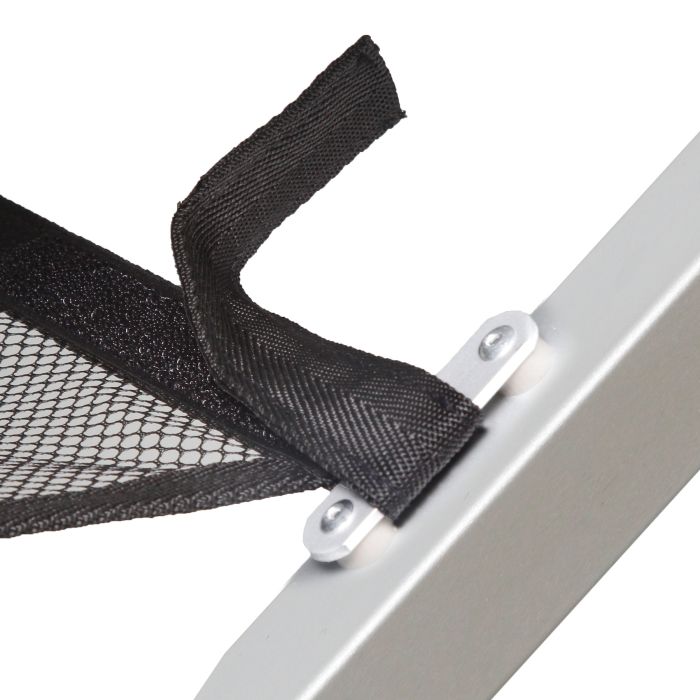 Patentirani aluminijski stol s lako sklopivim okvirom. Ima mrežasti prostor za pohranu. Stabilan okvir izrađen od kvadratnih aluminijskih cijevi s podešavanjem visine.