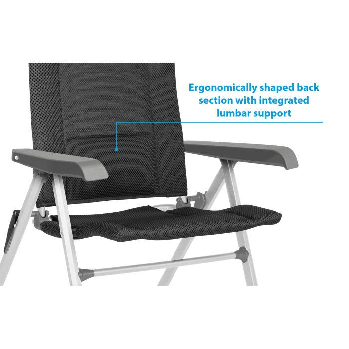 Udobna četveronožna stolica s visokim naslonom i potpuno novim okvirom koji štedi prostor, što je savršeno rješenje za one koji nemaju dovoljno prostora za pohranu u svom vozilu. Zahvaljujući posebnim zglobovima, moguće je preklopiti stražnju nogu stolice i naslon za glavu, čime se značajno smanjuje visina stolice u zatvorenom položaju. Sve to uz zadržavanje karakteristika udobnosti i elegancije tipičnih za sve modele kolekcije Rebel.