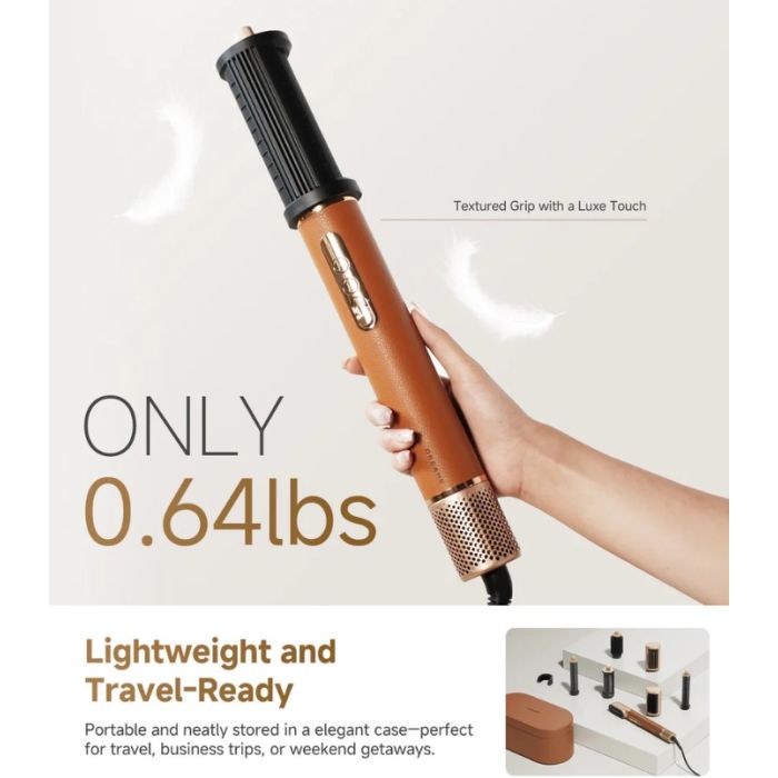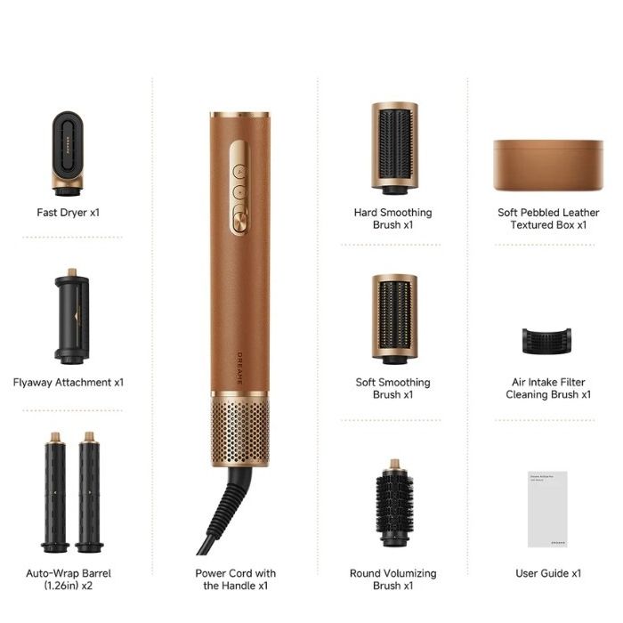 Set za oblikovanje kose – uređaj je pakiran u elegantnu kožnu torbicu, s uključenim umetcima, četkom za čišćenje filtera i priručnikom. Nudi sve što vam je potrebno za razne frizure.