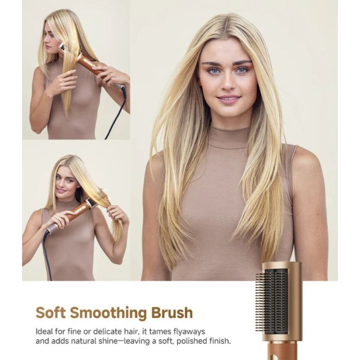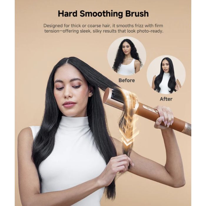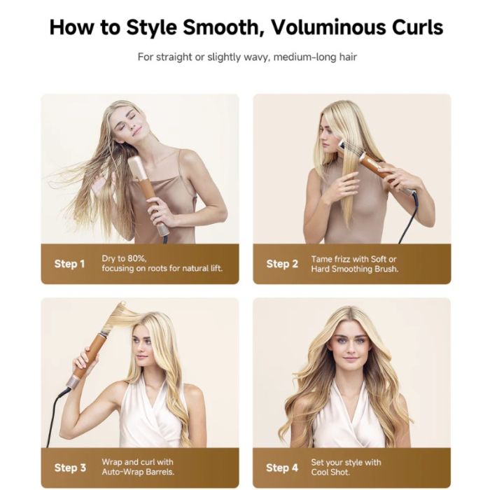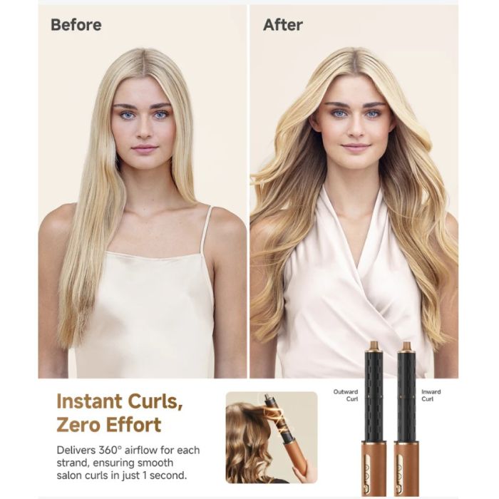 Više nastavaka za različite stilove - uključuje 2 nastavka za automatsko uvijanje (32 mm za uvijanje u suprotnim smjerovima), nastavak za sušilo za kosu, peglu za kosu koja se lako spušta, meku i tvrdu četku za ravnanje i okruglu četku za volumen. Svi nastavci imaju magnetski sustav pričvršćivanja.